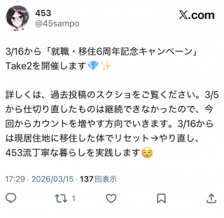 というワケで、3/5から現居住地に移住した体でリセット→やり直し、453流丁寧な暮らしを実践します