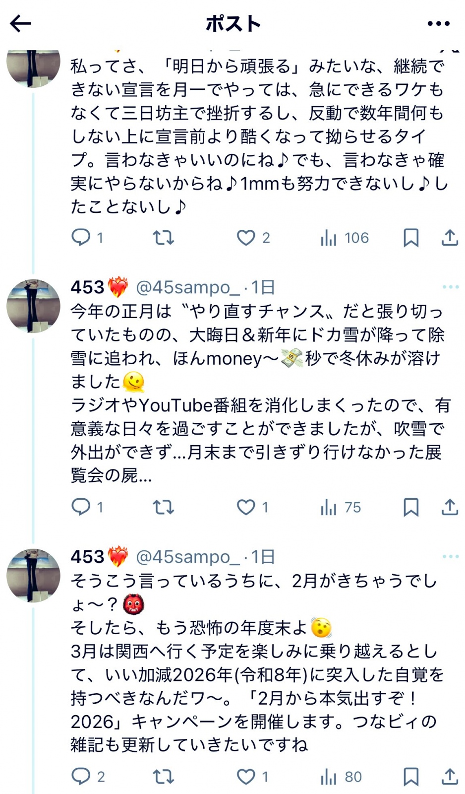 明後日から「就職・移住6周年記念キャンペーン」を開催します。詳しくは、過去投稿のスクショをご覧ください。2/1から始めたのは継続できませんでしたので、心機一転アカウントを作り直しました。というワケで、3/5から現居住地に移住した体でリセット→やり直し、453流丁寧な暮らしを実践します